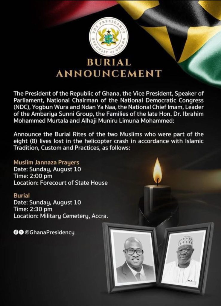 Ghana will bid farewell to two victims of the military helicopter crash, Ibrahim Murtala Muhammed and Muniru Mohammed, on August 10 after DNA analysis in South Africa confirmed their identities.